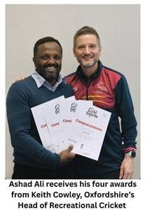 Ashad collected an Unsung Hero Award and Inspired To Play Award for his work at Horspath and Oxford University Club CC where he is also a member.